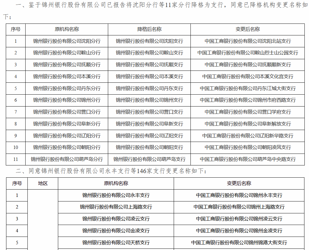 辽宁金融监管局发布《关于锦州银行股份有限公司157家支行变更名称的批复》。其中,锦州银行已报告将沈阳分行等11家分行降格为支行,与其余146家原锦州银行支行共同更名为工商银行支行。