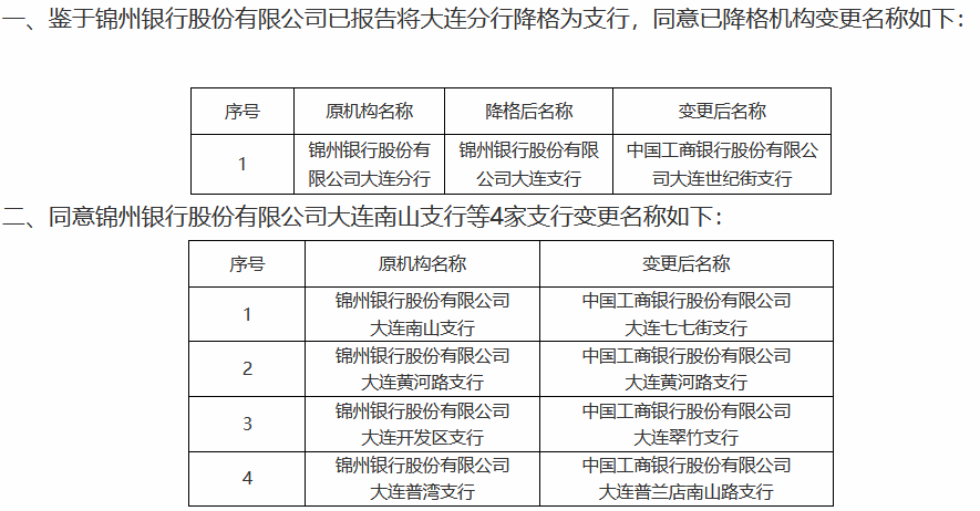 大连金融监管局发布《关于锦州银行股份有限公司5家支行变更名称的批复》。其中,大连分行已被报告降格为支行,变更后名称为“中国工商银行股份有限公司大连世纪街支行”,其余4家原支行变更为工商银行支行。