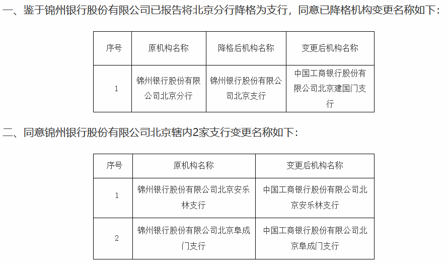 北京金融监管局发布《关于锦州银行股份有限公司3家支行变更名称的批复》。其中 ,北京分行已被报告降格为支行,变更后名称为“中国工商银行股份有限公司北京建国门支行”,其余2家原支行变更为工商银行支行。