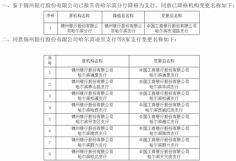 国家金融监督管理总局黑龙江监管局发布《关于锦州银行股份有限公司9家支行变更名称的批复》。其中,哈尔滨分行已报告降格为支行,变更后名称为“中国工商银行股份有限公司哈尔滨友谊路支行”,其余8家原支行变更为工商银行支行。