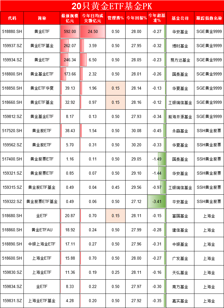 金价创历史新高!20只黄金ETF怎么选?华安黄金ETF今年规模翻倍逼近600亿,平安黄金股票ETF今年跑输基准3.4%