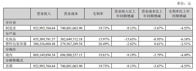 嘉亨家化业绩出现如此大的滑坡,主要与国内日化护肤市场需求不及预期有关。下游需求惨淡,公司化妆品销售额为4.55亿元,同比下降15.63%;塑料包装容器销售额为3.8亿元,同比下降2.82%。